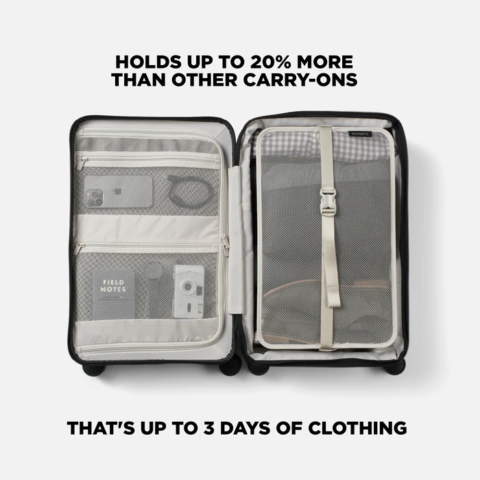 DESTROZAMOS LA CIENCIA y creamos un equipaje de mano con hasta un 20 % más de capacidad que otros equipajes de mano con las mismas dimensiones exteriores. Esto significa que puedes llevar ropa extra para hasta 3 días. Con materiales de primera calidad, cremalleras YKK, ruedas silenciosas de 360 ​​grados, tecnología de microsoldadura, cerraduras TSA integradas y capacidad de expansión cuando la necesitas. Method ha sido rigurosamente probado en más de 30 simulaciones reales y ha demostrado resistir las exigencias del viaje. También disponible en  tamaño facturable .